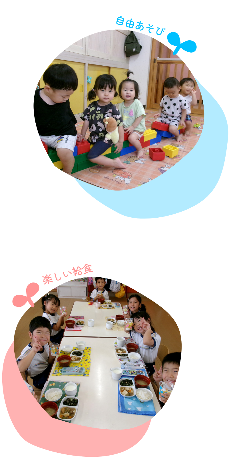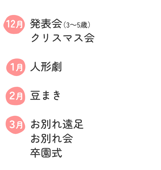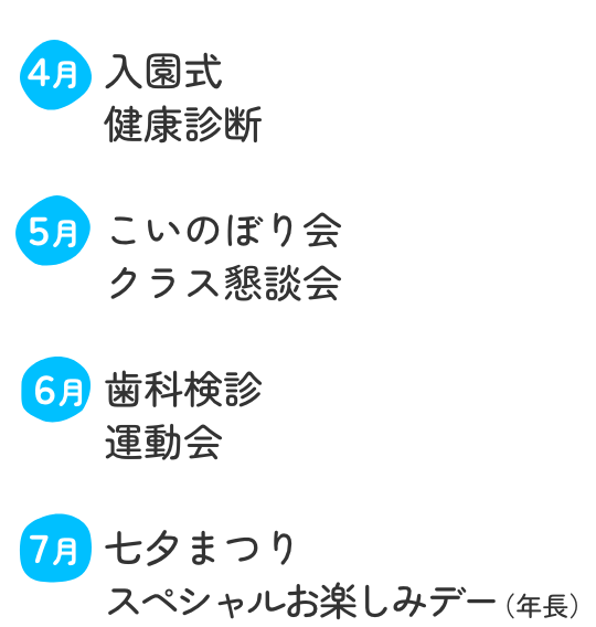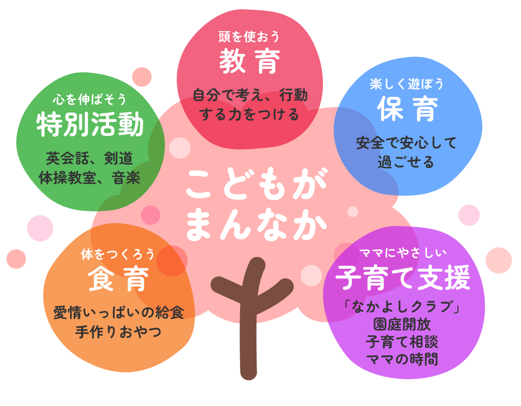 子どもたちは、初めて経験する集団生活の中で、たくさんの体験を通して、心も体も大きく成長していきます。当園では、子どもの年齢や発育に合わせたカリキュラムと環境を用意して、教職員が一丸となって楽しく温かい保育を実践しております。